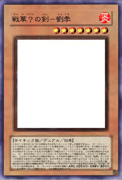 | このカード名の(3)(4)(5)の効果はそれぞれ1ターンに1度しか使用できない。 (1):フィールドの効果モンスター扱いのこのカードを通常召喚としてもう1度召喚できる。その場合このカードは通常モンスター扱いとなり効果を失う。 (2):手札・フィールド・墓地・除外ゾーン・デッキに存在するこのカードの元々の攻撃力・守備力は0/1000になる。この効果は無効化されない。 (3):自分の手札・フィールドのカード1枚を対象として発動出来る。そのカードを墓地に送り、このカードを手札から特殊召喚する。この効果を発動するターン、自分は「戦華」モンスターの効果を3度までしか発動できず、自分の手札を1枚選んで捨てなければ「ヌラブル」モンスター以外のモンスターの効果を使用できない。 (4):このカードが「ヌラブル」カードの効果で墓地に送られた場合に発動出来る。デッキから「ヌラブル」カード1枚を手札に加える。その後、カードを1枚召喚出来る。(5):モンスターの効果が発動した時、 自分フィールドの魔法・罠カード1枚を墓地へ送って発動できる。 その発動を無効にする。 | |||