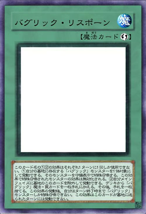 | このカード名の①②の効果はそれぞれ1ターンに1回しか使用できない。①自分の墓地に存在する「バグリック」モンスターを1体対象にして発動できる。そのモンスターを守備表示で特殊召喚する。この効果で特殊召喚されたモンスターの効果は無効化される。②自分メインフェイズに墓地のこのカードを除外して発動できる。デッキから「バグリック」魔法・罠カードを一枚手札に加える。その後、手札を一枚捨てる。この効果の発動後、自分はターン終了時まで「バグリック」モンスターしか特殊召喚できない。この効果はこのカードが墓地に送られたターンには発動できない。 | |||