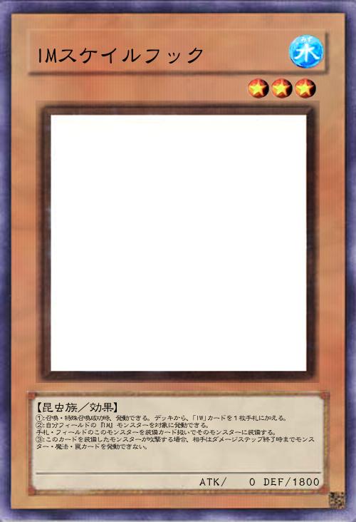 | ①:召喚・特殊召喚成功時、発動できる。デッキから、「IW」カードを1枚手札に加える。 ②:自分フィールドの『IM』モンスターを対象に発動できる。 手札・フィールドのこのモンスターを装備カード扱いでそのモンスターに装備する。 ③:このカードを装備したモンスターが攻撃する場合、相手はダメージステップ終了時までモンスター・魔法・罠カードを発動できない。 | |||