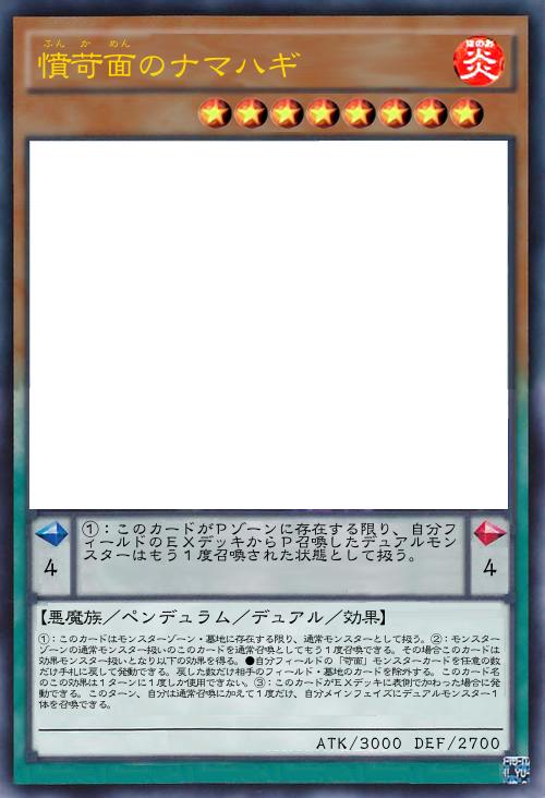 | ①:このカードはモンスターゾーン・墓地に存在する限り、通常モンスターとして扱う。②:モンスターゾーンの通常モンスター扱いのこのカードを通常召喚としてもう1度召喚できる。その場合このカードは効果モンスター扱いとなり以下の効果を得る。●自分フィールドの「苛面」モンスターカードを任意の数だけ手札に戻して発動できる。戻した数だけ相手のフィールド・墓地のカードを除外する。このカード名のこの効果は1ターンに1度しか使用できない。③:このカードがEXデッキに表側で加わった場合に発動できる。このターン、自分は通常召喚に加えて1度だけ、自分メインフェイズにデュアルモンスター1体を召喚できる。 | |||