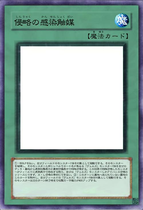 | ①:500LPを払い、自分フィールドのモンスター1体を対象として発動できる。そのモンスターを破壊し、そのモンスターと同じレベルでカード名が異なる「ヴェルズ」モンスター1体を自分のデッキ・墓地から表側攻撃表示か裏側守備表示で特殊召喚する。この効果で特殊召喚したモンスターがフィールドに表側表示で存在する限り、自分は「ヴェルズ」モンスターしかアドバンス召喚のリリースにできず、X・L召喚の素材にできない。②:このターンに墓地へ送られていない墓地のこのカードを除外し、自分フィールドの「ヴェルズ」モンスター1体を対象として発動できる。そのモンスターは次のターン終了時まで攻撃力・守備力が400アップする。 | |||