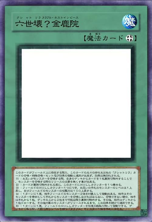 | このカードがフィールド上に存在する限り、このカードの元々の持ち主は他の「クシャトリラ」カードの召喚・特殊召喚・セット及び効果の発動と適用が出来ず、効果は無効化される。 (1):お互いがモンスターを召喚する際、自身のデッキからカードを1枚裏側で除外することで、モンスターを召喚する際のリリースの必要を無くす事が出来る。 (2):カードが裏側で除外される度に、このカードにNULLカウンターを1つ乗せる。 (3):フィールドのNULLカウンター1つにつき、お互いの手札のモンスターのレベルは1上昇し、自分フィールドのモンスターの攻撃力は100上昇する。 (4):1ターンに1度、相手フィールドのモンスター2体を対象として発動出来る。相手はそのモンスターを素材として手札からモンスターを召喚しなければならない。召喚できない場合、相手は手札から1枚、デッキの上から2枚まで可能な限り裏側で除外する。その後、相手はデッキから1枚ドローする。その後対象のモンスターがリリースされるまで、この効果を続けて適用できる。 (5):1ターンに1度、フィールドのNULLカウンターを任意の数取り除いて発動できる。デッキから取り除いた数と同じレベルを持つ「ヌラブル」モンスター1体を手札に加える。 | |||