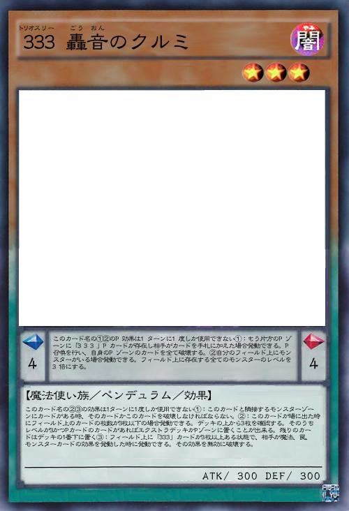 | このカード名の①②のP効果は1ターンに1度しか使用できない①:もう片方のPゾーンに「333」Pカードが存在し相手がカードを手札に加えた場合発動できる。P召喚を行い、自身のPゾーンのカードを全て破壊する。②自分のフィールド上にモンスターがいる場合発動できる。フィールド上に存在する全てのモンスターのレベルを3倍にする。 | |||