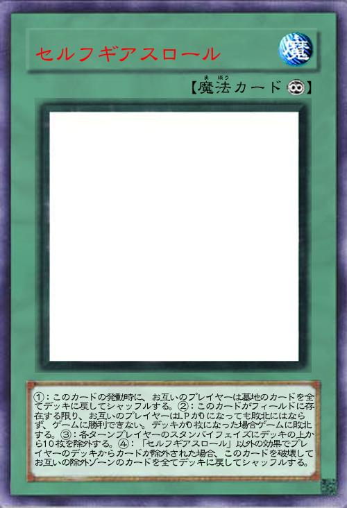 | ①:このカードの発動時に、お互いのプレイヤーは墓地のカードを全てデッキに戻してシャッフルする。②:このカードがフィールドに存在する限り、お互いのプレイヤーはLPが0になっても敗北にはならず、ゲームに勝利できない。デッキが0枚になった場合ゲームに敗北する。③:各ターンプレイヤーのスタンバイフェイズにデッキの上から10枚を除外する。④:「セルフギアスロール」以外の効果でプレイヤーのデッキからカードが除外された場合、このカードを破壊してお互いの除外ゾーンのカードを全てデッキに戻してシャッフルする。 | |||