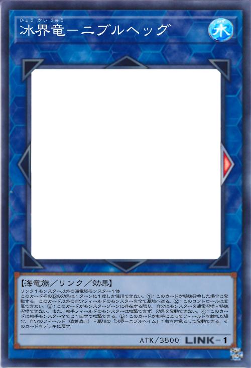 | リンク1モンスター以外の海竜族モンスター1体 このカード名の⑤の効果は1ターンに1度しか使用できない。①:このカードが特殊召喚した場合に発動する。このカード以外の自分フィールドのモンスターを全て墓地へ送る。②:このコントロールは変更できない。③:このカードがモンスターゾーンに存在する限り、自分はモンスターを通常召喚・特殊召喚できない。また、相手フィールドのモンスターは攻撃できず、効果を発動できない。④:このカードは相手モンスター全てに1回ずつ攻撃できる。⑤:このカードが相手によってフィールドを離れた場合、自分のフィールド(表側表示)・墓地の「冰界-ニブルヘイム」1枚を対象として発動できる。そのカードをデッキに戻す。 | |||
