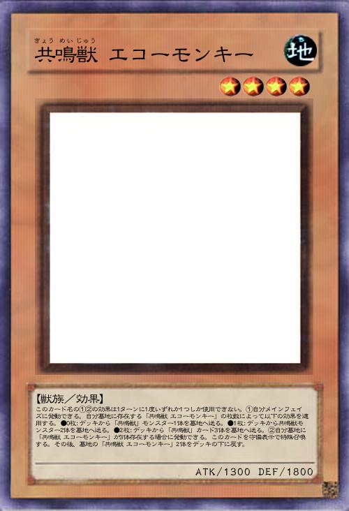 | このカード名の①②の効果は1ターンに1度いずれか1つしか使用できない。①自分メインフェイズに発動できる。自分墓地に存在する「共鳴獣 エコーモンキー」の枚数によって以下の効果を適用する。●0枚:デッキから「共鳴獣」モンスター1体を墓地ヘ送る。●1枚:デッキから共鳴獣モンスター2体を墓地へ送る。●2枚:デッキから「共鳴獣」カード3体を墓地へ送る。②自分墓地に「共鳴獣 エコーモンキー」が3体存在する場合に発動できる。このカードを守備表示で特殊召喚する。その後、墓地の「共鳴獣 エコーモンキー」2体をデッキの下に戻す。 | |||