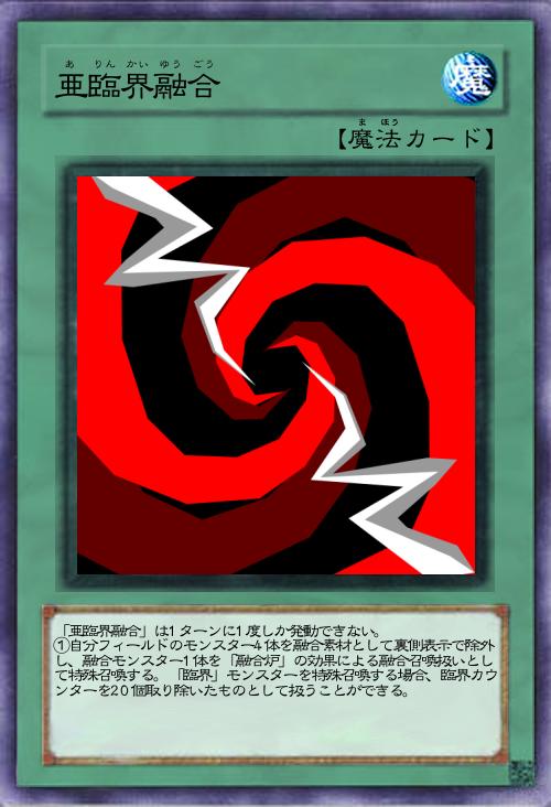 | 「亜臨界融合」は1ターンに1度しか発動できない。 ①自分フィールドのモンスター4体を融合素材として裏側表示で除外し、融合モンスター1体を「融合炉」の効果による融合召喚扱いとして特殊召喚する。「臨界」モンスターを特殊召喚する場合、臨界カウンターを20個取り除いたものとして扱うことができる。 | |||