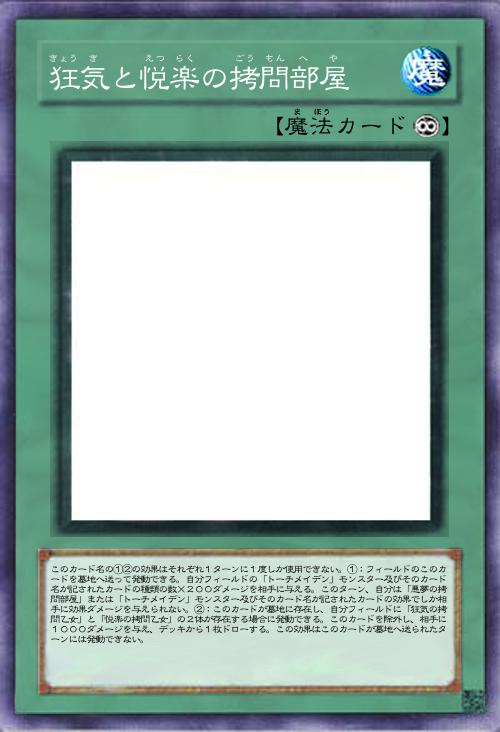 | このカード名の①②の効果はそれぞれ1ターンに1度しか使用できない。①:フィールドのこのカードを墓地へ送って発動できる。自分フィールドの「トーチメイデン」モンスター及びそのカード名が記されたカードの種類の数×200ダメージを相手に与える。このターン、自分は「悪夢の拷問部屋」または「トーチメイデン」モンスター及びそのカード名が記されたカードの効果でしか相手に効果ダメージを与えられない。②:このカードが墓地に存在し、自分フィールドに「狂気の拷問乙女」と「悦楽の拷問乙女」の2体が存在する場合に発動できる。このカードを除外し、相手に1000ダメージを与え、デッキから1枚ドローする。この効果はこのカードが墓地へ送られたターンには発動できない。 | |||
