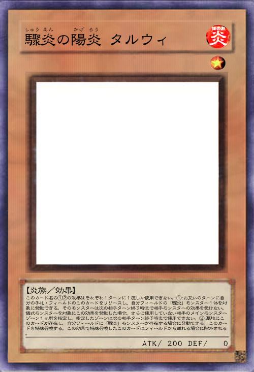 | このカード名の①②の効果はそれぞれ1ターンに1度しか使用できない。①:お互いのターンに自分の手札・フィールドのこのカードをリリースし、自分フィールドの「驟炎」モンスター1体を対象に発動できる。そのモンスターは次の相手ターン終了時まで相手モンスターの効果を受けない。儀式モンスターを対象にこの効果を発動した場合、さらに使用していない相手のメインモンスターゾーン1ヶ所を指定し、指定したゾーンは次の相手ターン終了時まで使用できない。②:墓地にこのカードが存在し、自分フィールドに「驟炎」モンスターが存在する場合に発動できる。このカードを特殊召喚する。この効果で特殊召喚したこのカードはフィールドから離れる場合に除外される。 | |||