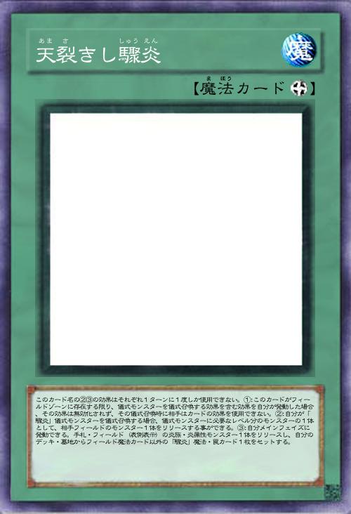 | このカード名の②③の効果はそれぞれ1ターンに1度しか使用できない。①:このカードがフィールドゾーンに存在する限り、儀式モンスターを儀式召喚する効果を含む効果を自分が発動した場合、その効果は無効化されず、その儀式召喚時に相手はカードの効果を使用できない。②:自分が「驟炎」儀式モンスターを儀式召喚する場合、儀式モンスターに必要なレベル分のモンスターの1体として、相手フィールドのモンスター1体をリリースする事ができる。③:自分メインフェイズに発動できる。手札・フィールド(表側表示)の炎族・炎属性モンスター1体をリリースし、自分のデッキ・墓地からフィールド魔法カード以外の「驟炎」魔法・罠カード1枚をセットする。 | |||