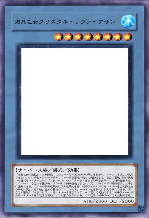ウォーター・リヴァイアサン@イグニスターをモチーフにマリンセス名称の儀式モンスターにしてみました。ウォーター・リヴァイアサンの効果を強化しつつ、展開にも絡められるようにネクロスのような手札効果をつけました。」(2023-09-19 20:48)
