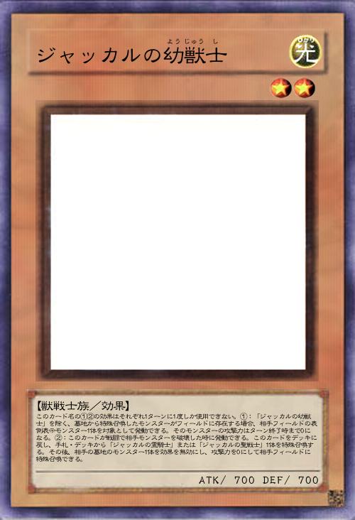 | このカード名の①②の効果はそれぞれ1ターンに1度しか使用できない。①:「ジャッカルの幼獣士」を除く、墓地から特殊召喚したモンスターがフィールドに存在する場合、相手フィールドの表側表示モンスター1体を対象として発動できる。そのモンスターの攻撃力はターン終了時まで0になる。②:このカードが戦闘で相手モンスターを破壊した時に発動できる。このカードをデッキに戻し、手札・デッキから「ジャッカルの霊騎士」または「ジャッカルの聖戦士」1体を特殊召喚する。その後、相手の墓地のモンスター1体を効果を無効にし、攻撃力を0にして相手フィールドに特殊召喚できる。 | |||