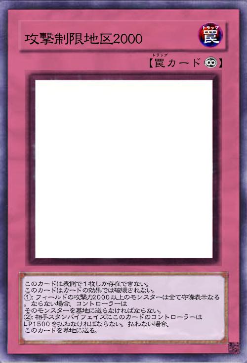 | このカードは表側で1枚しか存在できない。 このカードはカードの効果では破壊されない。 ①:フィールドの攻撃力2000以上のモンスターは全て守備表示なる。ならない場合、コントローラーは そのモンスターを墓地に送らなければならない。 ②:相手スタンバイフェイズにこのカードのコントローラーは LP1500を払わなければならない。払わない場合、 このカードを墓地に送る。 | |||