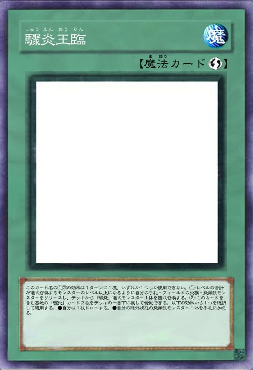 | このカード名の①②の効果は1ターンに1度、いずれか1つしか使用できない。①:レベルの合計が儀式召喚するモンスターのレベル以上になるように自分の手札・フィールドの炎族・炎属性モンスターをリリースし、デッキから「驟炎」儀式モンスター1体を儀式召喚する。②:このカードを含む墓地の「驟炎」カード2枚をデッキの一番下に戻して発動できる。以下の効果から1つを選択して適用する。●自分は1枚ドローする。●自分の除外状態の炎属性モンスター1体を手札に加える。 | |||