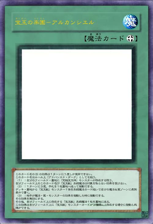 | このカード名の(3)の効果は1ターンに1度しか使用できない。 このカード名はルール上「アドバンスド・ダーク」としても扱う。 (1):自分のフィールド・墓地に「究極宝玉神」モンスターが存在する限り、 自分フィールド上のこのカード及び「宝玉獣」永続魔法は対象を取らない効果を受けない。 (2):1ターンに3度、手札を1枚墓地へ送って発動できる。 デッキ・墓地から「宝玉獣」モンスター1体を永続魔法カード扱いで自分の魔法&罠ゾーンに表側表示で置く。 (3):相手が魔法・罠・モンスターの効果を発動した時に発動できる。 その効果を無効にする。 その後、自分フィールド上に存在する「宝玉獣」永続魔法1枚を墓地に送る。 この効果は自分フィールド上に「宝玉獣」モンスターカードが3種類以上存在する場合に発動と処理ができる。 | |||