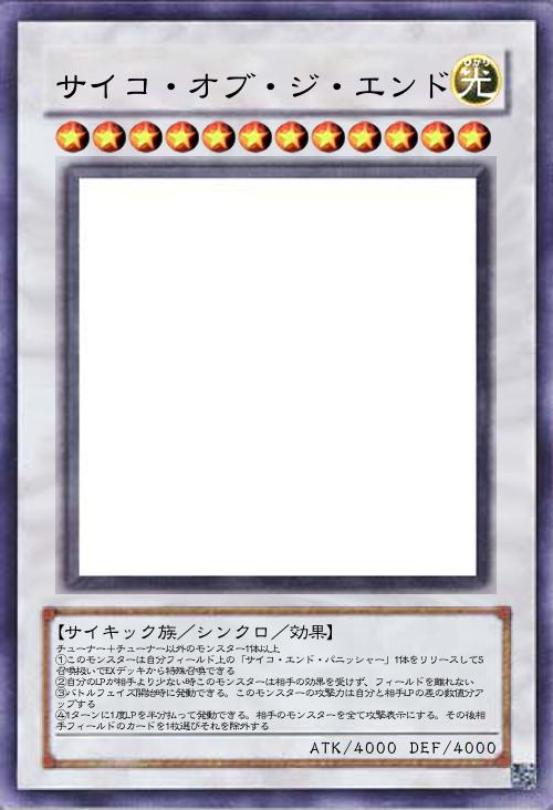 | チューナー+チューナー以外のモンスター1体以上 ①このモンスターは自分フィールド上の「サイコ・エンド・パニッシャー」1体をリリースしてS召喚扱いでEXデッキから特殊召喚できる ②自分のLPが相手より少ない時このモンスターは相手の効果を受けず、フィールドを離れない ③バトルフェイズ開始時に発動できる。このモンスターの攻撃力は自分と相手LPの差の数値分アップする ④1ターンに1度LPを半分払って発動できる。相手のモンスターを全て攻撃表示にする。その後相手フィールドのカードを1枚選びそれを除外する | |||