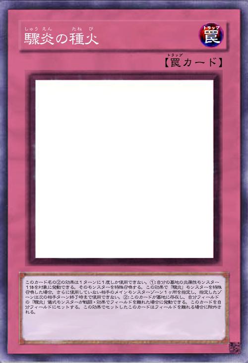| このカード名の②の効果は1ターンに1度しか使用できない。①:自分の墓地の炎属性モンスター1体を対象に発動できる。そのモンスターを特殊召喚する。この効果で「驟炎」モンスターを特殊召喚した場合、さらに使用していない相手のメインモンスターゾーン1ヶ所を指定し、指定したゾーンは次の相手ターン終了時まで使用できない。②:このカードが墓地に存在し、自分フィールドの「驟炎」儀式モンスターが戦闘・効果でフィールドを離れた場合に発動できる。このカードを自分フィールドにセットする。この効果でセットしたこのカードはフィールドを離れる場合に除外される。 | |||