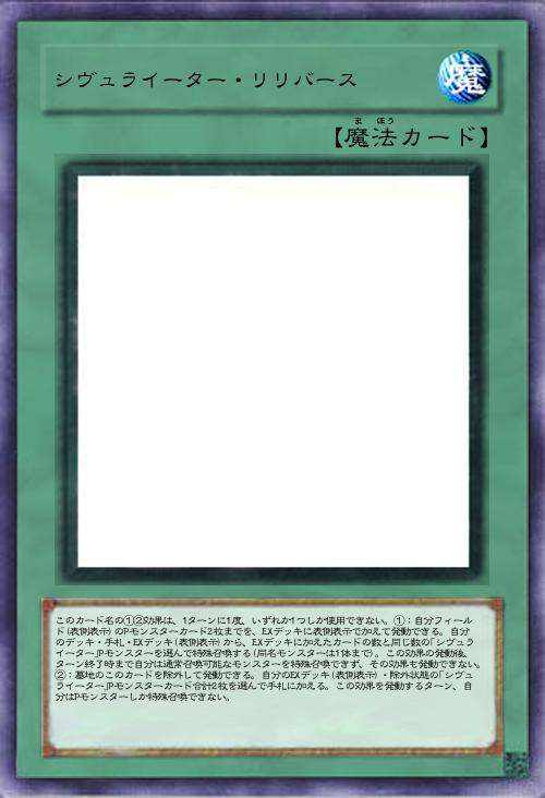 | このカード名の①②効果は、1ターンに1度、いずれか1つしか使用できない。①:自分フィールド(表側表示)のPモンスターカード2枚までを、EXデッキに表側表示で加えて発動できる。自分のデッキ・手札・EXデッキ(表側表示)から、EXデッキに加えたカードの数と同じ数の「シヴュライーター」Pモンスターを選んで特殊召喚する(同名モンスターは1体まで)。この効果の発動後、ターン終了時まで自分は通常召喚可能なモンスターを特殊召喚できず、その効果も発動できない。②:墓地のこのカードを除外して発動できる。自分のEXデッキ(表側表示)・除外状態の「シヴュライーター」Pモンスターカード合計2枚を選んで手札に加える。この効果を発動するターン、自分はPモンスターしか特殊召喚できない。 | |||