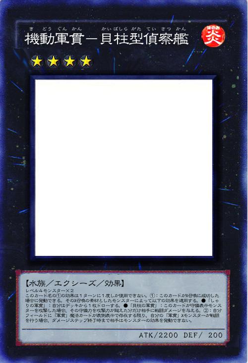 | レベル4モンスター×2 このカード名の①の効果は1ターンに1度しか使用できない。①:このカードがX召喚に成功した場合に発動できる。そのX召喚の素材としたモンスターによって以下の効果を適用する。●「しゃりの軍貫」:自分はデッキから1枚ドローする。●「貝柱の軍貫」:このカードが守備表示モンスターを攻撃した場合、その守備力を攻撃力が超えた分だけ相手に戦闘ダメージを与える。②:自分フィールドに「軍貫」魔法カードが表側表示で存在する限り、自分の「軍貫」Xモンスターが戦闘を行う場合、ダメージステップ終了時まで相手はモンスターの効果を発動できない。 | |||