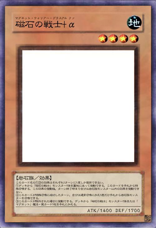 | このカード名の①③の効果はそれぞれ1ターンに1度しか使用できない。 ①デッキから「磁石の戦士」モンスター1体を墓地に送って発動できる。このカードを手札から特殊召喚する。この効果の発動後、ターン終了時まで自分は岩石族モンスター以外の効果を発動できない。 ②このカードが特殊召喚に成功したターン、自分は通常召喚に加え1度だけ手札から岩石族モンスターを召喚できる。 ③このカードが除外された場合に発動できる。デッキから「磁石の戦士」モンスター1体または「マグネット」魔法・罠カード1枚を手札に加える。 | |||
