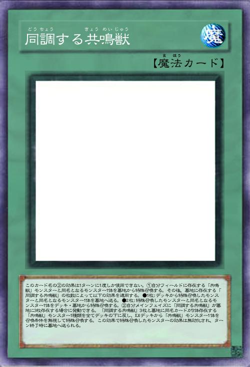 | このカード名の②の効果は1ターンに1度しか使用できない。①自分フィールドに存在する「共鳴獣」モンスターと同名となるモンスター1体を墓地から特殊召喚する。その後、墓地に存在する「同調する共鳴獣」の枚数によって以下の効果を適用する。●1枚:デッキから特殊召喚したモンスターと同名となるモンスター1体を墓地へ送る。●2枚:特殊召喚したモンスターと同名となるモンスター1体をデッキ・墓地から特殊召喚する。②自分メインフェイズに「同調する共鳴獣」が墓地に3枚存在する場合に発動できる。「同調する共鳴獣」3枚と墓地に同名カードが3体存在する「共鳴獣」モンスター1種類を全てデッキの下に戻し、EXデッキから「共鳴獣」モンスター1体を召喚条件を無視して特殊召喚する。この効果で特殊召喚したモンスターの効果は無効化され、ターン終了時に墓地へ送られる。 | |||
