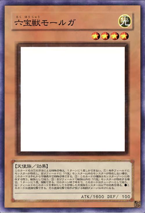 | このカード名の①の方法による特殊召喚は、1ターンに1度しかできない。①:相手フィールドにモンスターが存在し、自分フィールドに「六宝」モンスター以外のモンスターが存在しない場合、このカードは手札から守備表示で特殊召喚できる。②:このカードの種族はモンスターゾーンに存在する限り、獣族として扱う。③:自分フィールドで獣族以外の「六宝」モンスターが存在する場合、1ターンに1度、発動できる。次のターン終了時まで、このカードはチューナーとして扱う。④:フィールドのこのカードを素材としてS召喚した天使族モンスターは以下の効果を得る。●このカードは直接攻撃できる。その直接攻撃で相手が受ける戦闘ダメージは半分になる。 | |||