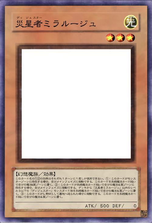 | このカード名の①②の効果はそれぞれ1ターンに1度しか使用できない。①:このカードがモンスターゾーンに存在する場合、自分メインフェイズに発動できる。このカードを永続魔法カード扱いで自分の魔法&罠ゾーンに置く。②:このカードが永続魔法カード扱いで自分の魔法&罠ゾーンに存在する場合、自分メインフェイズに発動できる。デッキから「災星者ミラルージュ」以外のレベル3以下の「ディジェスター」モンスター1体を永続魔法カード扱いで自分の魔法&罠ゾーンに置く。③:このカードがL素材として墓地へ送られた場合に発動できる。このカードを永続魔法カード扱いで自分の魔法&罠ゾーンに置く。 | |||
