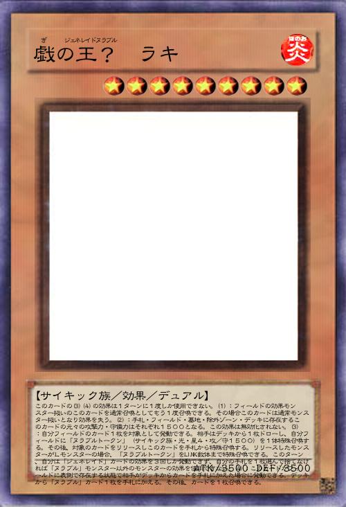 | このカードの(3)(4)の効果は1ターンに1度しか使用できない。(1):フィールドの効果モンスター扱いのこのカードを通常召喚としてもう1度召喚できる。その場合このカードは通常モンスター扱いとなり効果を失う。(2):手札・フィールド・墓地・除外ゾーン・デッキに存在するこのカードの元々の攻撃力・守備力はそれぞれ1500となる。この効果は無効化されない。(3):自分フィールドのカード1枚を対象として発動できる。相手はデッキから1枚ドローし、自分フィールドに「ヌラブルトークン」(サイキック族・光・星4・攻/守1500)を1体特殊召喚する。その後、対象のカードをリリースしこのカードを手札から特殊召喚する。リリースしたモンスターがLモンスターの場合、「ヌラブルトークン」をLINK数体まで特殊召喚できる。このターン、自分は「ジェネレイド」カードの効果を3回しか発動できず、自分の手札を1枚選んで捨てなければ「ヌラブル」モンスター以外のモンスターの効果を使用できない。(4):このカードがフィールドに表側で存在する状態で相手がデッキからカードを手札に加えた場合に発動できる。デッキから「ヌラブル」カード1枚を手札に加える。その後、カードを1枚召喚できる。 | |||