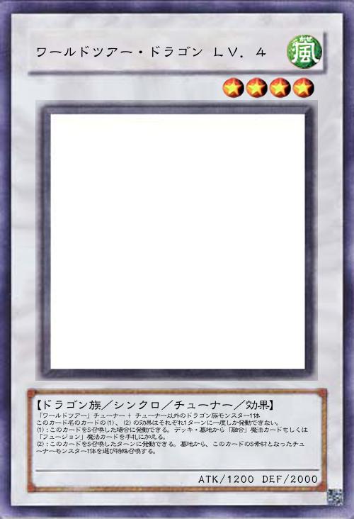 | 「ワールドツアー」チューナー + チューナー以外のドラゴン族モンスター1体 このカード名のカードの(1)、(2)の効果はそれぞれ1ターンに一度しか発動できない。 (1):このカードをS召喚した場合に発動できる。デッキ・墓地から「融合」魔法カードもしくは「フュージョン」魔法カードを手札に加える。 (2):このカードをS召喚したターンに発動できる。墓地から、このカードのS素材となったチューナーモンスター1体を選び特殊召喚する。 | |||