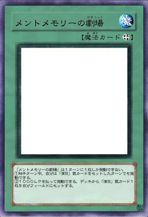 | 「メントメモリーの劇場」は1ターンに1枚しか発動できない。 ①相手ターン中、自分は「演目」罠カードをセットしたターンでも発動できる。 ②1000LPを払って発動できる。デッキから「演目」罠カード1枚を自分フィールドにセットする。 | |||