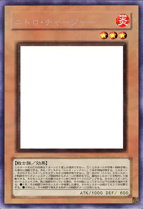 | このカード名の①の効果は1ターンに1度しか使用できない。①:このカードが召喚・特殊召喚した場合に発動できる。手札・デッキから「ニトロ・シンクロン」1体を特殊召喚する。このターン、自分はSモンスターしかEXデッキから特殊召喚できない。②:自分の「ニトロ」Sモンスターが戦闘を行うダメージステップ開始時からダメージ計算前までに、墓地のこのカードを除外して発動できる。そのモンスターの攻撃力はターン終了時まで1000アップする。そのモンスターがこのバトルフェイズ中、既に戦闘を行っている場合、その回数によってさらに以下の効果を適用できる。●1回:その戦闘で相手モンスターを破壊した場合、そのモンスターは続けてもう1回攻撃できる。●2回以上:その戦闘で発生する相手への戦闘ダメージは倍になる。 | |||
