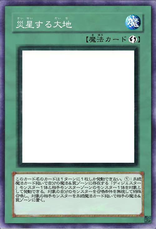 | このカード名のカードは1ターンに1枚しか発動できない。①:永続魔法カード扱いで自分の魔法&罠ゾーンに存在する「ディジェスター」モンスター1体と相手モンスターゾーンのモンスター1体を対象として発動できる。対象の自分のモンスターを召喚条件を無視して特殊召喚し、対象の相手モンスターを永続魔法カード扱いで相手の魔法&罠ゾーンに置く。 | |||