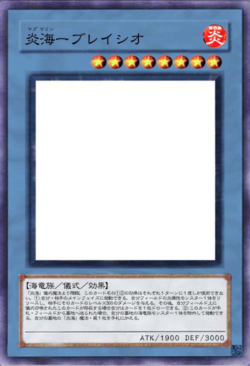 | 「炎海」儀式魔法より降臨。このカード名の①②の効果はそれぞれ1ターンに1度しか使用できない。①:自分・相手のメインフェイズに発動できる。自分フィールドの炎属性モンスター1体をリリースし、相手にそのカードのレベル×300のダメージを与える。その後、自分フィールド上に儀式召喚されたこのカードが存在する場合自分はカードを1枚ドローできる。②:このカードが手札・フィールドから墓地へ送られた場合、自分の墓地の海竜族モンスター1体を除外して発動できる。自分の墓地の「炎海」魔法・罠1枚を手札に加える。 | |||