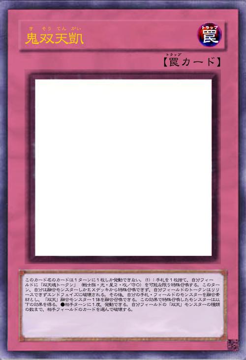 | このカード名のカードは1ターンに1枚しか発動できない。(1):手札を1枚捨て、自分フィールドに「双天魂トークン」(戦士族・光・星2・攻/守0)を可能な限り特殊召喚する。このターン、自分は融合モンスターしかEXデッキから特殊召喚できず、自分フィールドのトークンはリリースできずエンドフェイズに破壊される。その後、自分の手札・フィールドのモンスターを融合素材とし、「双天」融合モンスター1体を融合召喚できる。この効果で特殊召喚したモンスターは以下の効果を得る。●相手ターンに1度、発動できる。自分フィールドの「双天」モンスターの種類の数まで、相手フィールドのカードを選んで破壊する。 | |||