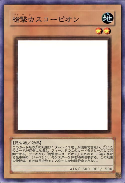 | このカード名の①の効果は1ターンに1度しか使用できない。①:このカードが召喚した場合、フィールドのこのカードをリリースして発動できる。デッキから「槍撃虫スコーピオン」以外のカード名の異なる昆虫族の「ジャベリン」モンスター2体を特殊召喚する。この効果の発動後、自分は昆虫族モンスターしか特殊召喚できない。 | |||