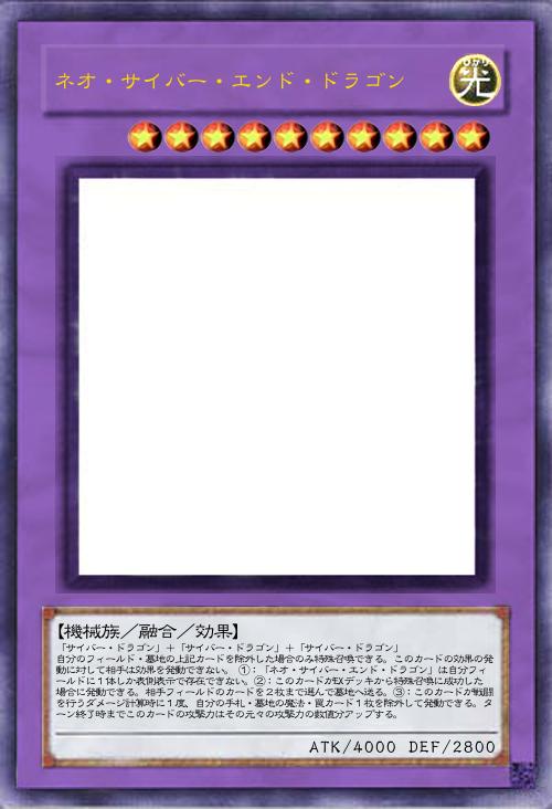 | 「サイバー・ドラゴン」+「サイバー・ドラゴン」+「サイバー・ドラゴン」 自分のフィールド・墓地の上記カードを除外した場合のみ特殊召喚できる。このカードの効果の発動に対して相手は効果を発動できない。 ①:「ネオ・サイバー・エンド・ドラゴン」は自分フィールドに1体しか表側表示で存在できない。②:このカードがEXデッキから特殊召喚に成功した場合に発動できる。相手フィールドのカードを2枚まで選んで墓地へ送る。③:このカードが戦闘を行うダメージ計算時に1度、自分の手札・墓地の魔法・罠カード1枚を除外して発動できる。ターン終了時までこのカードの攻撃力はその元々の攻撃力の数値分アップする。 | |||