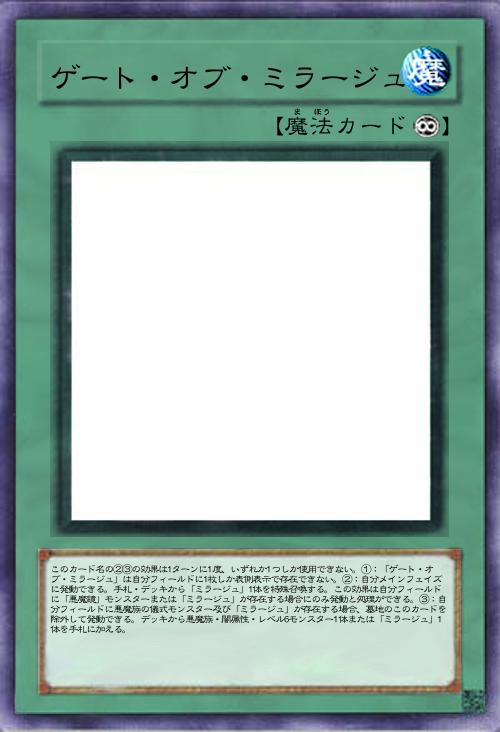 | このカード名の②③の効果は1ターンに1度、いずれか1つしか使用できない。①:「ゲート・オブ・ミラージュ」は自分フィールドに1枚しか表側表示で存在できない。②:自分メインフェイズに発動できる。手札・デッキから「ミラージュ」1体を特殊召喚する。この効果は自分フィールドに「悪魔鏡」モンスターまたは「ミラージュ」が存在する場合にのみ発動と処理ができる。③:自分フィールドに悪魔族の儀式モンスター及び「ミラージュ」が存在する場合、墓地のこのカードを除外して発動できる。デッキから悪魔族・闇属性・レベル6モンスター1体または「ミラージュ」1体を手札に加える。 | |||