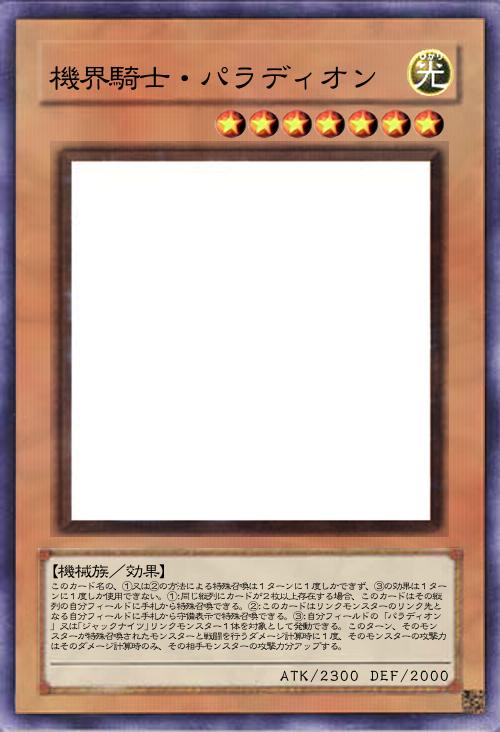 | このカード名の、①又は②の方法による特殊召喚は1ターンに1度しかできず、③の効果は1ターンに1度しか使用できない。①:同じ縦列にカードが2枚以上存在する場合、このカードはその縦列の自分フィールドに手札から特殊召喚できる。②:このカードはリンクモンスターのリンク先となる自分フィールドに手札から守備表示で特殊召喚できる。③:自分フィールドの「パラディオン」又は「ジャックナイツ」リンクモンスター1体を対象として発動できる。このターン、そのモンスターが特殊召喚されたモンスターと戦闘を行うダメージ計算時に1度、そのモンスターの攻撃力はそのダメージ計算時のみ、その相手モンスターの攻撃力分アップする。 | |||