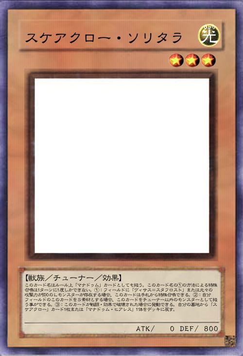| このカード名はルール上「マナドゥム」カードとしても扱う。このカード名の①の方法による特殊召喚は1ターンに1度しかできない。①:フィールドに「ヴィサス=スタフロスト」または元々の攻撃力が500のLモンスターが存在する場合、このカードは手札から特殊召喚できる。②:自分フィールドのこのカードをS素材とする場合、このカードをチューナー以外のモンスターとして扱う事ができる。③:このカードが戦闘・効果で破壊された場合に発動できる。自分の墓地から「スケアクロー」カード1枚または「マナドゥム・ヒアレス」1体をデッキに戻す。 | |||