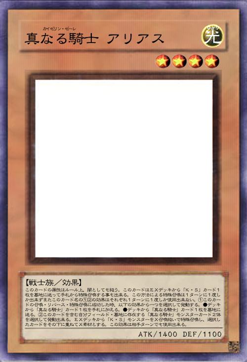 | このカードの属性はルール上、闇としても扱う。このカードはEXデッキから「K・S」カード1枚を墓地に送って手札から特殊召喚する事も出来る。この方法による特殊召喚は1ターンに1度しか出来ずまたこのカード名の①②の効果はそれぞれ1ターンに1度しか使用出来ない。①このカードの召喚・リバース・特殊召喚に成功した時、以下の効果から一つを選択して発動する。●デッキから「真なる騎士」カード1枚を手札に加える。●デッキから「真なる騎士」カード1枚を墓地に送る。②このカードを含む自分フィールド・墓地に存在する「真なる騎士」モンスターカード2体を選択して発動出来る。EXデッキから「K・S」モンスターをX召喚扱いで特殊召喚し、選択したカードをその下に重ねてX素材とする。この効果は相手ターンでも使用出来る。 | |||