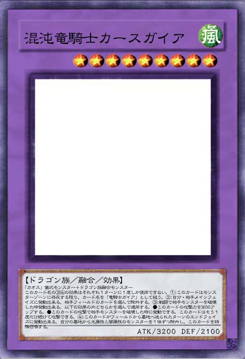 | 「カオス」儀式モンスター+ドラゴン族融合モンスター このカード名の③④の効果はそれぞれ1ターンに1度しか使用できない。①:このカードはモンスターゾーンに存在する限り、カード名を「竜騎士ガイア」として扱う。②:自分・相手メインフェイズに発動出来る。相手フィールドのカードを選んで除外する。③:戦闘で相手モンスターを破壊した時発動出来る。以下の効果の内どちらかを選んで適用する。●このカードの攻撃力を3200アップする。●このカードの攻撃で相手モンスターを破壊した時に発動できる。このカードはもう1度だけ続けて攻撃できる。④:このカードがフィールドから墓地へ送られたターンのエンドフェイズに発動出来る。自分の墓地から光属性と闇属性のモンスターを1体ずつ除外し、このカードを特殊召喚する。 | |||