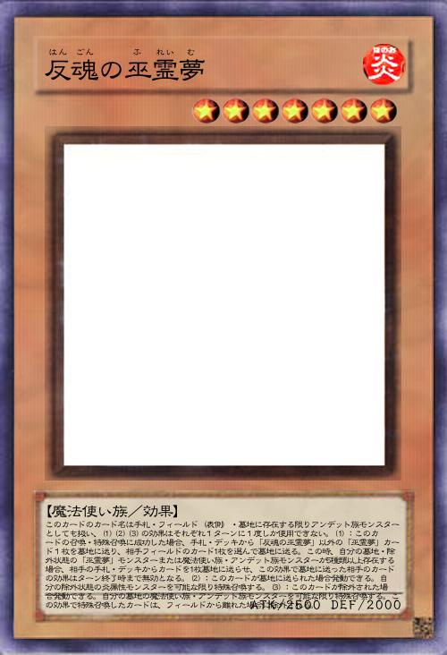 | このカードのカード名は手札・フィールド(表側)・墓地に存在する限りアンデット族モンスターとしても扱い、(1)(2)(3)の効果はそれぞれ1ターンに1度しか使用できない。(1):このカードの召喚・特殊召喚に成功した場合、手札・デッキから「反魂の巫霊夢」以外の「巫霊夢」カード1枚を墓地に送り、相手フィールドのカード1枚を選んで墓地に送る。この時、自分の墓地・除外状態の「巫霊夢」モンスターまたは魔法使い族・アンデット族モンスターが5種類以上存在する場合、相手の手札・デッキからカードを1枚墓地に送らせ、この効果で墓地に送った相手のカードの効果はターン終了時まで無効となる。(2):このカードが墓地に送られた場合発動できる。自分の除外状態の炎属性モンスターを可能な限り特殊召喚する。(3):このカードが除外された場合発動できる。自分の墓地の魔法使い族・アンデット族モンスターを可能な限り特殊召喚する。この効果で特殊召喚したカードは、フィールドから離れた場合に除外される。 | |||