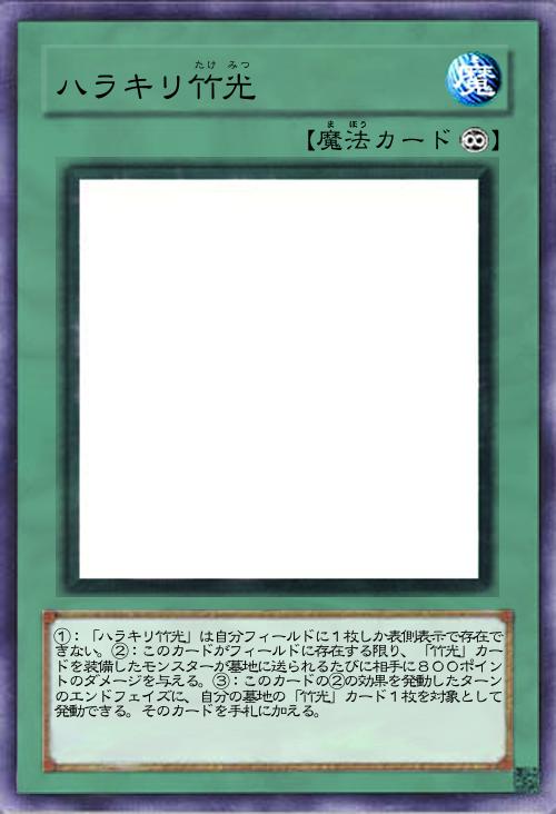 | ①:「ハラキリ竹光」は自分フィールドに1枚しか表側表示で存在できない。②:このカードがフィールドに存在する限り、「竹光」カードを装備したモンスターが墓地に送られるたびに相手に800ポイントのダメージを与える。③:このカードの②の効果を発動したターンのエンドフェイズに、自分の墓地の「竹光」カード1枚を対象として発動できる。そのカードを手札に加える。 | |||