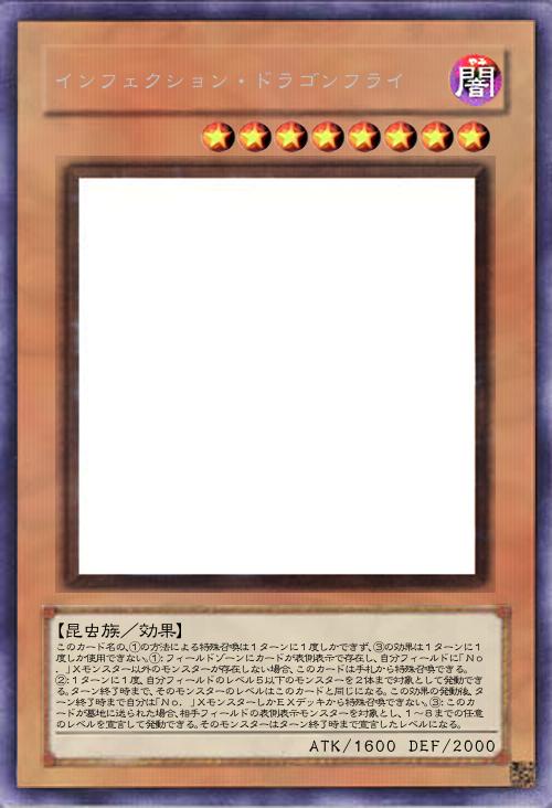 | このカード名の、①の方法による特殊召喚は1ターンに1度しかできず、③の効果は1ターンに1度しか使用できない。①:フィールドゾーンにカードが表側表示で存在し、自分フィールドに「No. 」Xモンスター以外のモンスターが存在しない場合、このカードは手札から特殊召喚できる。 ②:1ターンに1度、自分フィールドのレベル5以下のモンスターを2体まで対象として発動できる。ターン終了時まで、そのモンスターのレベルはこのカードと同じになる。この効果の発動後、ターン終了時まで自分は「No. 」XモンスターしかEXデッキから特殊召喚できない。③:このカードが墓地に送られた場合、相手フィールドの表側表示モンスターを対象とし、1~8までの任意のレベルを宣言して発動できる。そのモンスターはターン終了時まで宣言したレベルになる。 | |||