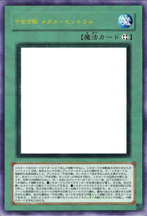| このカード名のカードは1ターンに1枚しか発動できない。このカードの発動後5回目の自分スタンバイフェイズ時、相手よりLPが多いプレイヤーはデュエルに勝利する。(1):このカードの発動時の効果処理として、デッキから「千金万駆」モンスター1体を手札に加える事ができる。 (2):自分フィールドに「千金万駆」モンスターが存在する限り、このカードは効果の対象にならず、効果では破壊されない。(3):お互いのプレイヤーは1ターンに1度、以下の効果から1つを選択して発動できる。●このカードにゴルドカウンターを任意の数だけ置く。その後、自分は置いたカウンターの数×1000LPを失う。●このカードのゴルドカウンターを任意の数だけ取り除く。その後、自分は取り除いたカウンターの数×1000LP回復する。(4):フィールドゾーンの表側表示のこのカードが相手の効果でフィールドから離れ、墓地へ送られた場合または除外された場合、自分の墓地の「千金万駆」カードを3枚まで対象として発動できる(同名カードは1枚まで)。お互いにこのカードに置かれていたゴルドカウンターの数×500LP回復し、対象のカードを手札に加える。 | |||