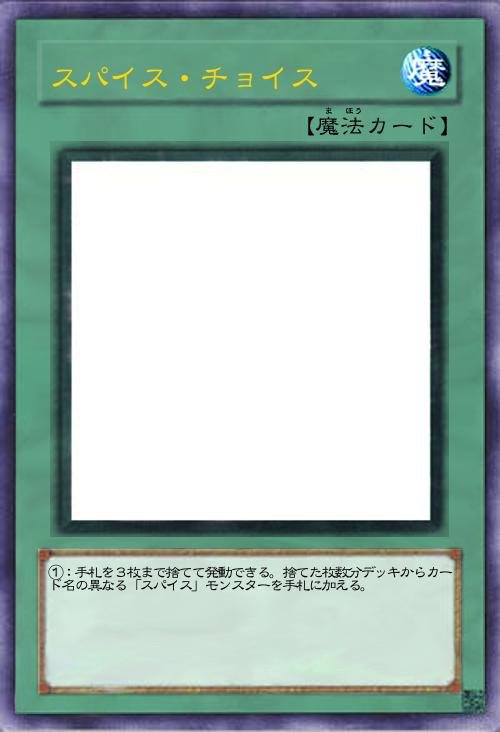| ①:手札を3枚まで捨てて発動できる。捨てた枚数分デッキからカード名の異なる「スパイス」モンスターを手札に加える。 | |||