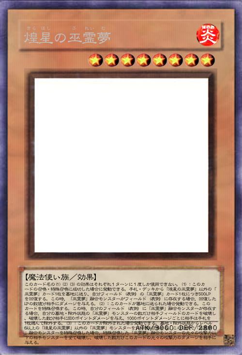 | このカード名の(1)(2)(3)の効果はそれぞれ1ターンに1度しか使用できない。(1):このカードの召喚・特殊召喚に成功した場合に発動できる。手札・デッキから「煌星の巫霊夢」以外の「巫霊夢」カード1枚を墓地に送り、自分フィールド(表側)の「巫霊夢」カード1枚につき500LPを回復する。この時、「巫霊夢」融合モンスターがフィールド(表側)に存在する場合、回復したLPの数値分相手にダメージを与える。(2):このカードが墓地に送られた場合発動できる。このカードを特殊召喚する。この時、自分のフィールド(表側)に「巫霊夢」融合モンスターが存在する場合、自分の墓地・除外状態の「巫霊夢」モンスターの数だけ相手フィールドのカードを破壊し、破壊した数分相手に500ポイントダメージを与え、1000ポイントダメージごとに相手は手札を1枚選んで除外する。(3):このカードが除外された場合発動できる。墓地・除外状態からレベル6以上の「煌星の巫霊夢」以外の「巫霊夢」モンスターを1体特殊召喚する。この効果で「巫霊夢」融合モンスターを特殊召喚した場合、特殊召喚した「巫霊夢」融合モンスターの元々の攻撃力以下の相手モンスターを全て破壊し、破壊した数だけこのカードの元々の攻撃力のダメージを相手に与える。 | |||