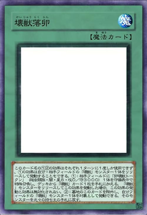 | このカード名の①②の効果はそれぞれ1ターンに1度しか使用できず、①の効果は自分・相手フィールドの「壊獣」モンスター1体をリリースして発動することもできる。①:相手フィールドに「卵壊獣トークン」(爬虫類族・闇・星8・攻0/守3000)1体を守備表示で特殊召喚し、デッキから「壊獣」カード1枚を手札に加える。「壊獣」モンスターをリリースしてこの効果を発動した場合、この効果の発動と効果は無効化されない。②:墓地のこのカードを除外し、自分フィールドの「壊獣」モンスター1体を対象として発動できる。そのモンスターを元々の持ち主の手札に戻す。 | |||