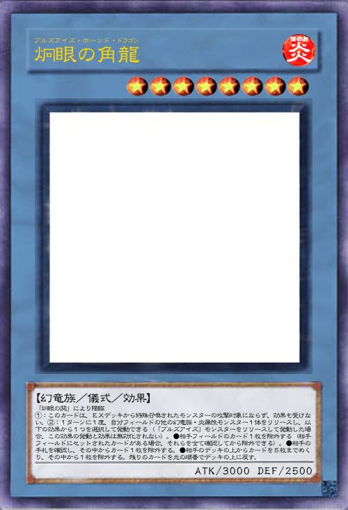 | 「炯眼の鬨」により降臨 ①:このカードは、EXデッキから特殊召喚されたモンスターの攻撃対象にならず、効果も受けない。②:1ターンに1度、自分フィールドの他の幻竜族・炎属性モンスター1体をリリースし、以下の効果から1つを選択して発動できる(「ブルズアイズ」モンスターをリリースして発動した場合、この効果の発動と効果は無効化されない)。●相手フィールドのカード1枚を除外する(相手フィールドにセットされたカードがある場合、それらを全て確認してから除外できる)。●相手の手札を確認し、その中からカード1枚を除外する。●相手のデッキの上からカードを5枚までめくり、その中から1枚を除外する。残りのカードを元の順番でデッキの上に戻す。 | |||