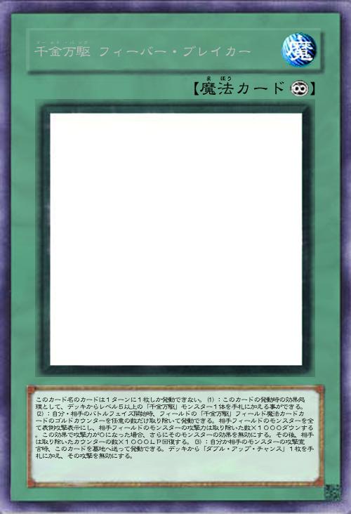 | このカード名のカードは1ターンに1枚しか発動できない。(1):このカードの発動時の効果処理として、デッキからレベル5以上の「千金万駆」モンスター1体を手札に加える事ができる。 (2):自分・相手のバトルフェイズ開始時、フィールドの「千金万駆」フィールド魔法カードカードのゴルドカウンターを任意の数だけ取り除いて発動できる。相手フィールドのモンスターを全て表側攻撃表示にし、相手フィールドのモンスターの攻撃力は取り除いた数×1000ダウンする。この効果で攻撃力が0になった場合、さらにそのモンスターの効果を無効にする。その後、相手は取り除いたカウンターの数×1000LP回復する。(3):自分か相手のモンスターの攻撃宣言時、このカードを墓地へ送って発動できる。デッキから「ダブル・アップ・チャンス」1枚を手札に加え、その攻撃を無効にする。 | |||